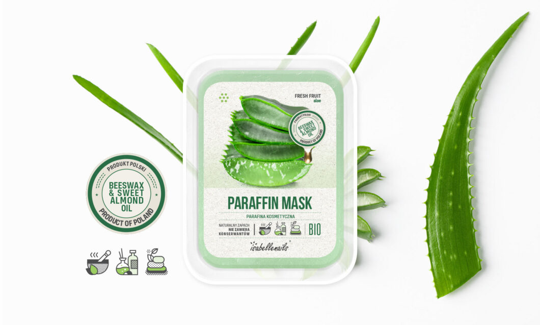 Linia Paraffin Mask w estetyce fresh & clean: biel, pastelowe kodowanie wariantów (aloes/arbuz) oraz duży, soczysty key visual składnika. Medalion “Beeswax & Sweet Almond Oil” z kroplą + piktogramy rytuału spa komunikują naturalny skład, BIO, brak konserwantów. Lekki, modułowy front na tackach zapewnia szybki odczyt w drogerii i łatwe skalowanie linii.