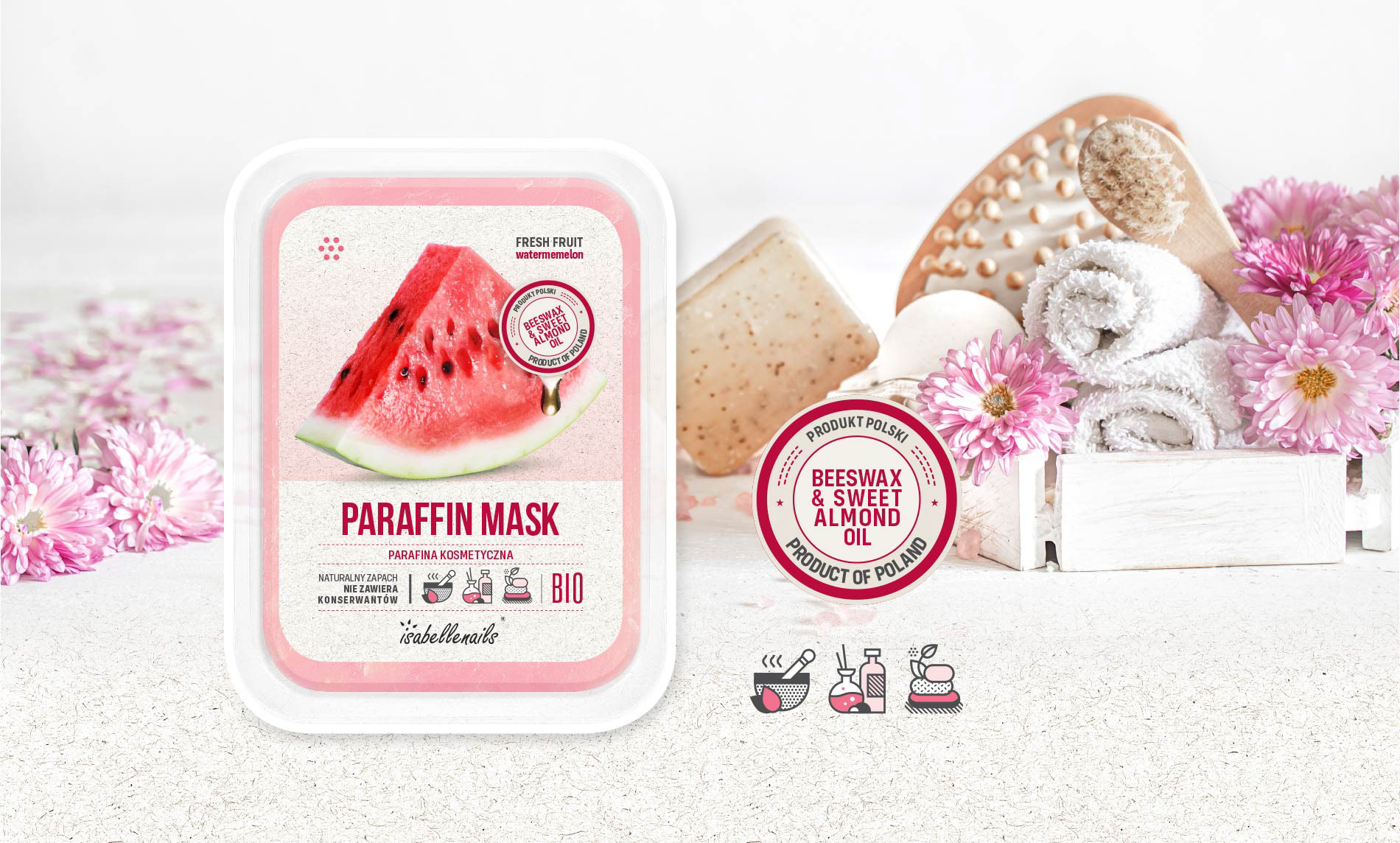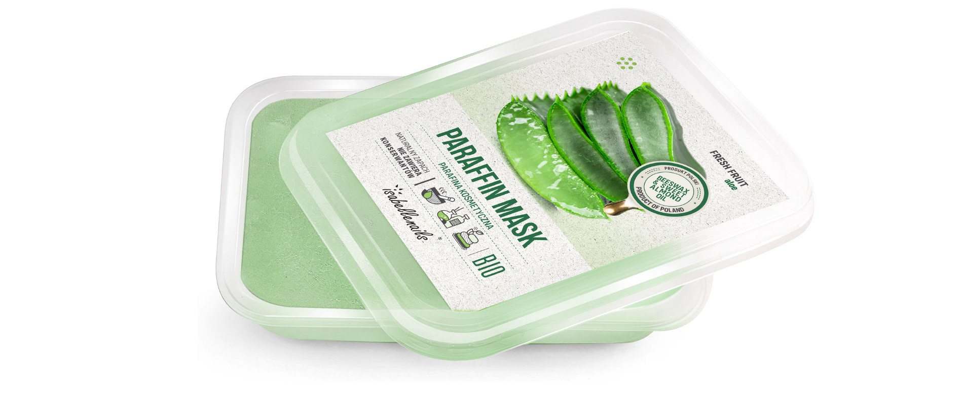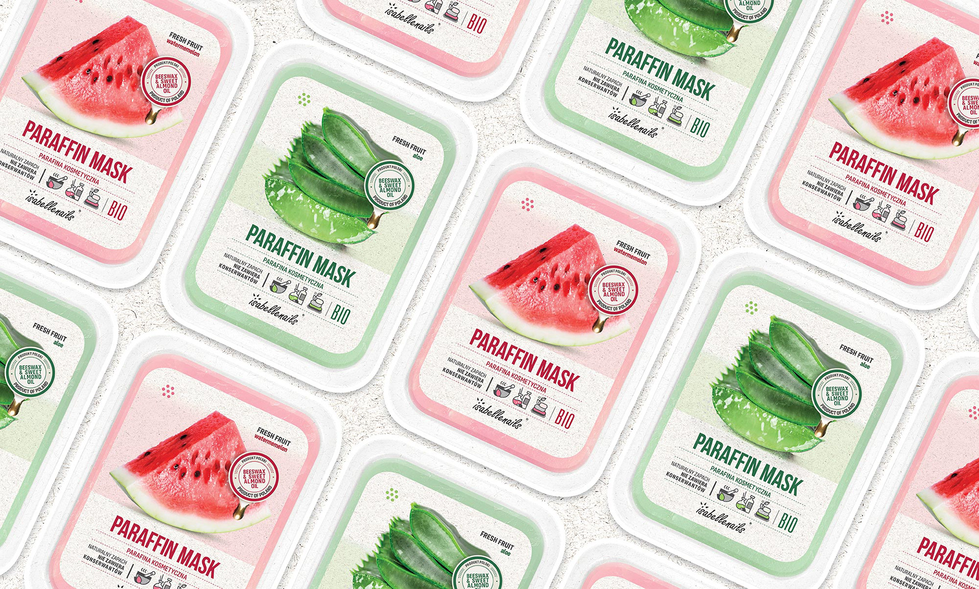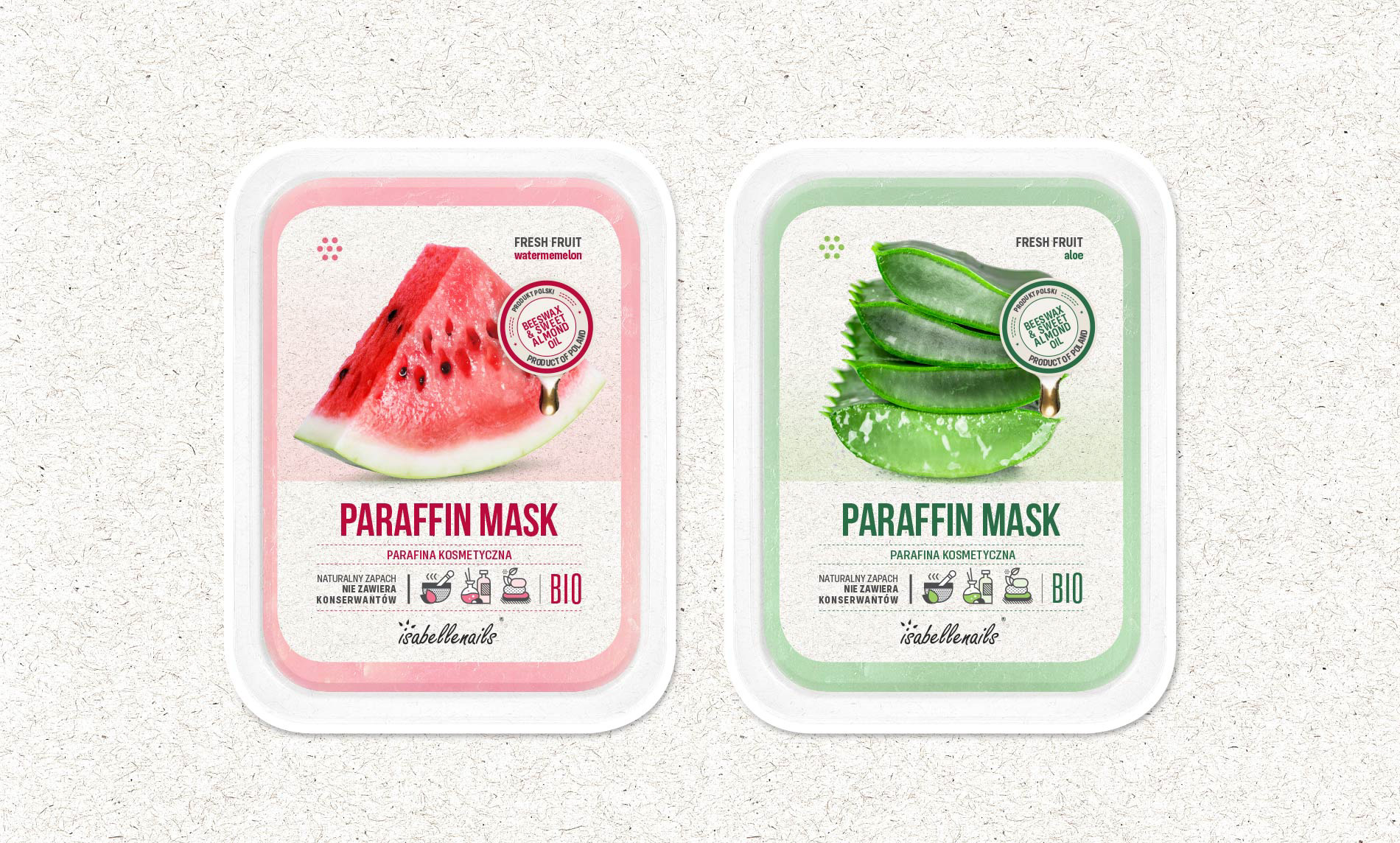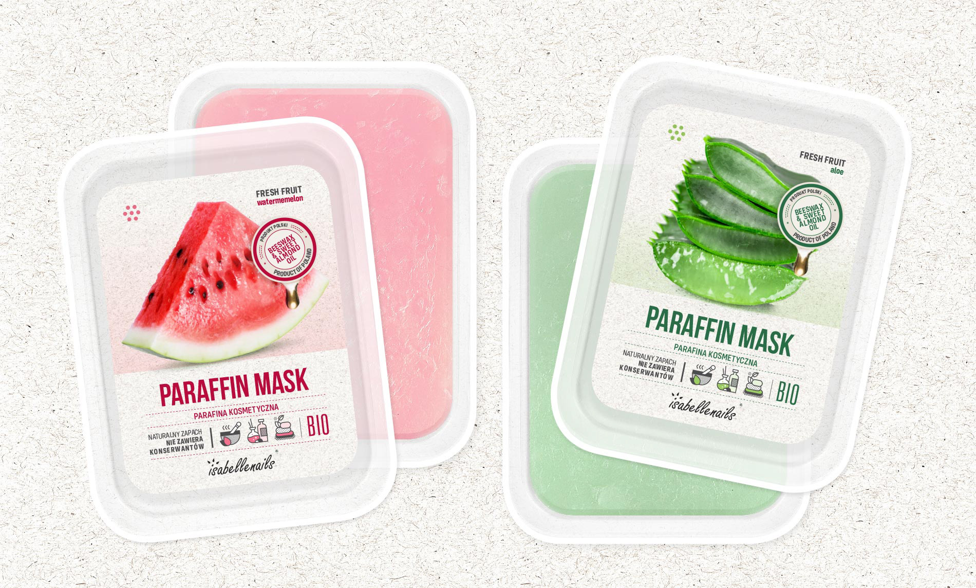 Linia Paraffin Mask w estetyce fresh & clean: biel, pastelowe kodowanie wariantów (aloes/arbuz) oraz duży, soczysty key visual składnika. Medalion “Beeswax & Sweet Almond Oil” z kroplą + piktogramy rytuału spa komunikują naturalny skład, BIO, brak konserwantów. Lekki, modułowy front na tackach zapewnia szybki odczyt w drogerii i łatwe skalowanie linii.