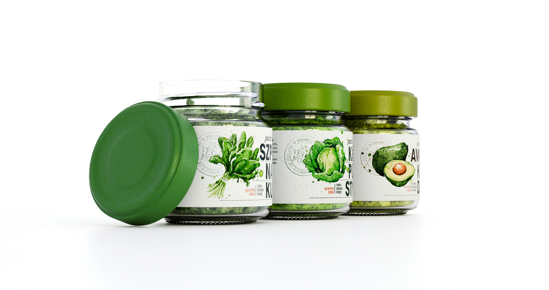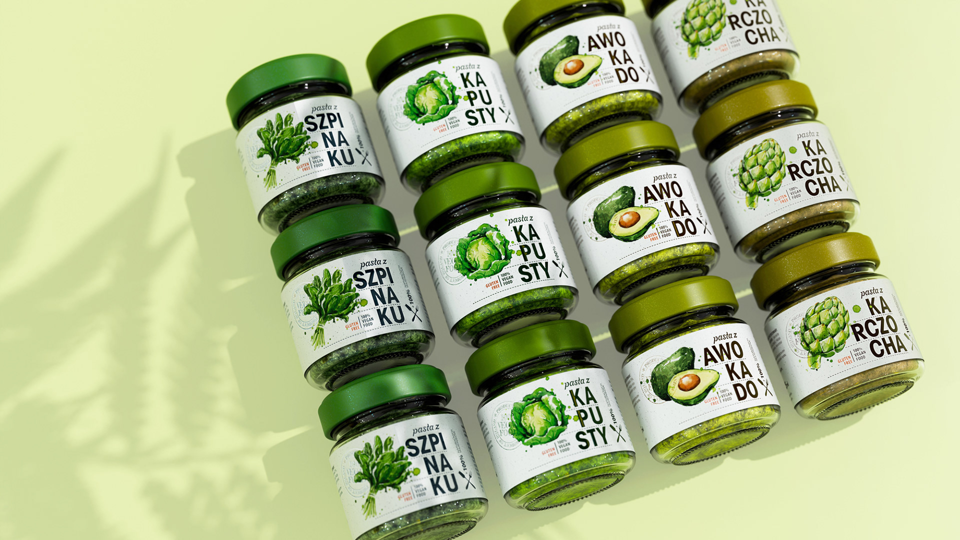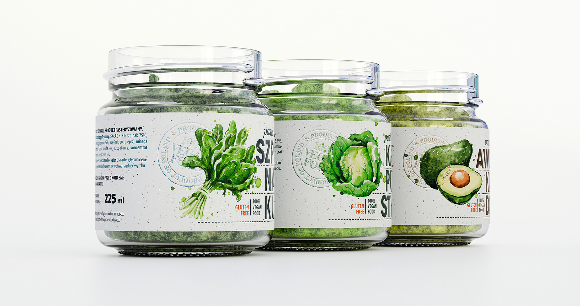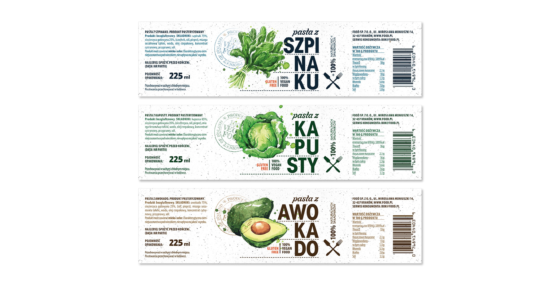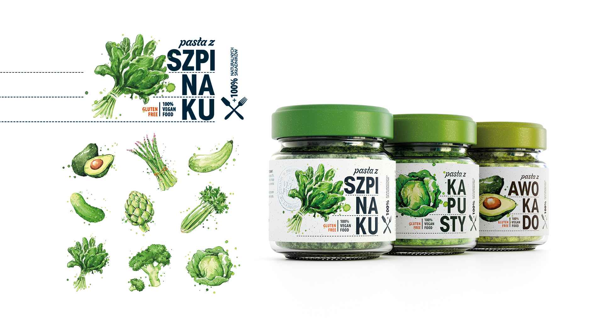 Etykiety past warzywnych w estetyce fresh & clean: biel z fakturą papieru + akwarelowe ilustracje (szpinak, kapusta, awokado) budują natychmiastowy efekt „naturalnie i świeżo”. Duża, łamana typografia (SZPI-NA-KU / KA-PU-STY / AWO-KA-DO) oraz zielone wieczka gwarantują szybki shelf scan i czytelne wariantowanie; piktogramy gluten free / 100% vegan spinają USP. Lekki, modułowy layout łatwo skaluje się na kolejne smaki — apetyczny wygląd bez straty spójności.